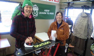 そう!!大好評のステッカープレゼントです!! さっそくヘルメットにはって大喜びです!! ハーフのウルトラ先生と一緒にパシャ♪ また一緒に滑りましょー!!